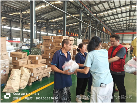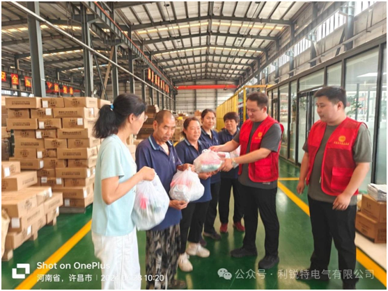 2024年6月28号,许昌经济开发区总工会联合利锐特电气工会为职工送上夏日福利。酷暑难耐,开发区总工会的同志头顶烈日,不停往返于建筑工地和生产车间一线,把毛巾、白糖、绿豆等防暑降温用品准备好。